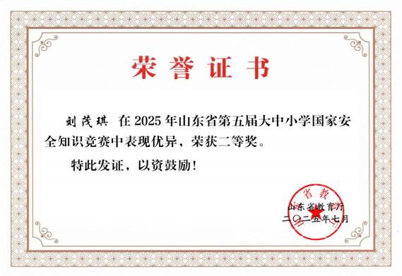 刘茂琪荣获第五届大中小学国家安全知识竞赛二等奖,徐希泽、郭鑫森获三等奖;于子洋、张志锐、孙计轩、王安南获国家安全情景剧优秀奖;张美欣、牛婷婷获国家安全演讲比赛优秀奖;李新春作品评为国家安全精品课参加展播;刘笑涵获“同上一堂国家安全课”优秀节目。