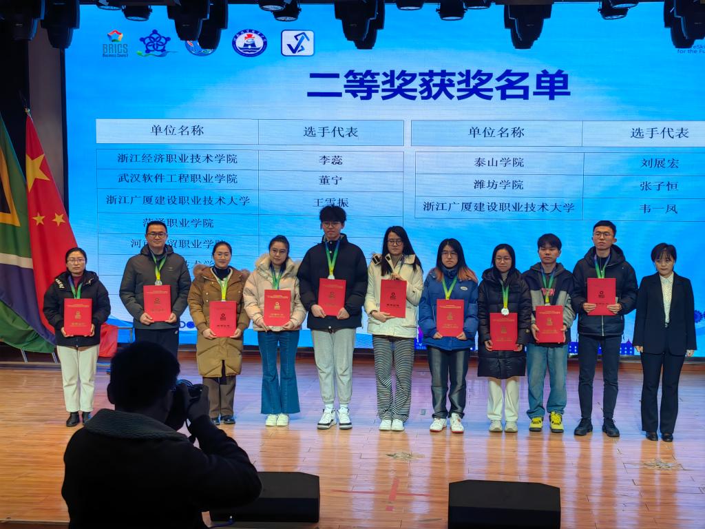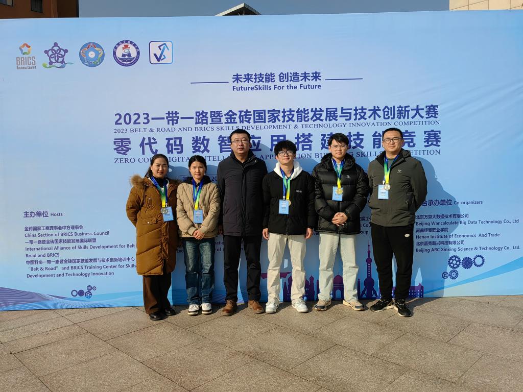 11月25—26日,2023一带一路暨金砖国家技能发展与技术创新大赛之零代码数智应用搭建赛项全国决赛在河南经贸职业学院举行,我院郭晗、孟兆豪、李晓晴以满分成绩获高职学生组一等奖第一名,指导教师为徐茜、刘晓;徐茜、冯宁获教师组二等奖,学院获最佳组织奖。