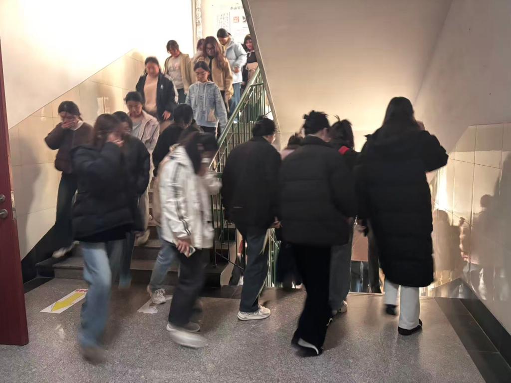 消防应急演练开始前,系部明确撤离路线、行动准则及注意事项,安排专人担任各楼层引导员,提前检查楼梯间通道畅通情况,确保演练有序开展。警报声响起,各楼层学生迅速响应,严格遵守纪律,撤离过程中,学生全程靠右行走、留出救援通道,双手或衣袖捂住口鼻,弯腰低姿前行,无拥挤、推搡、逆行现象,各引导员在楼梯口、拐角处实时疏导,保障撤离高效安全。此次演练从警报响起到全体学生到达指定集合点,全程耗时短、秩序佳,实现“全员参与、全程规范”目标,有效检验了学生的应急反应能力与系部的应急调度能力,现场学生均表示“掌握了实用的防撤离技巧,安全意识更牢固”。