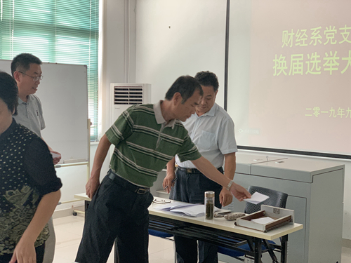 会议伊始,财经系党支部书记李金伟代表财经系党支部委员会作工作报告。随后,党支部副书记张建明同志宣读《选举办法》。之后,大会表决通过了财经系党支部委员选举监票人、计票人以及支部委员候选人名单。经过在场党员的无记名投票,差额选举产生了新一届财经系党支部委员会委员,分别是李金伟、张建明、傅晓玉、路伟和毕玉洁五位同志。