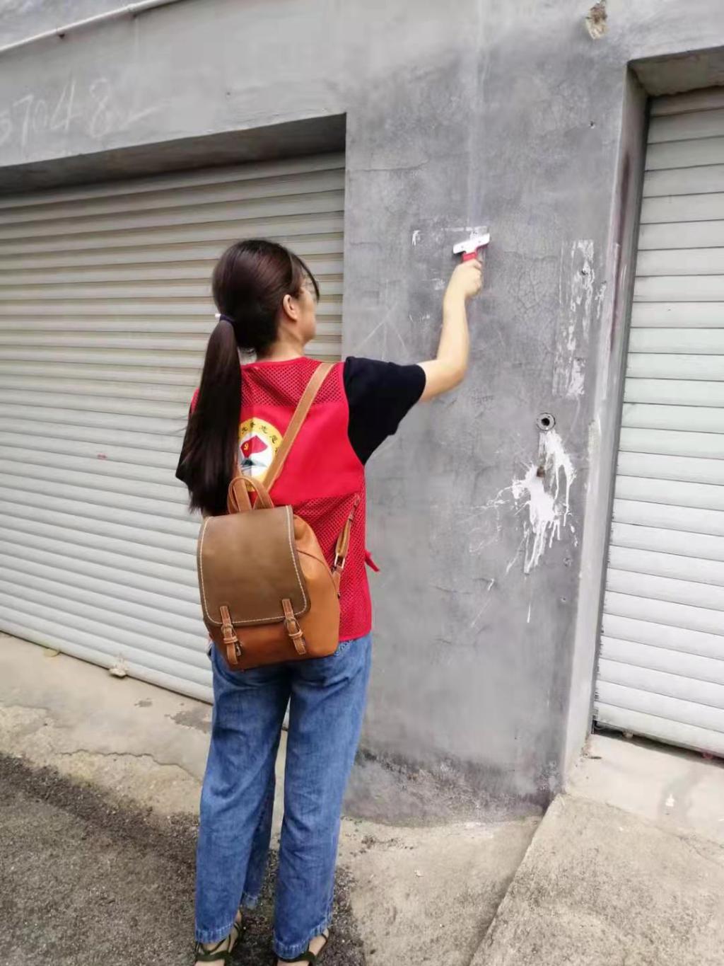 上午8点20,志愿者们身穿志愿者马甲,拿着清洁工具,进行社区环境卫生的清扫工作。在小区的主要干道的绿化带旁打扫卫生、去除墙皮广告纸、清理垃圾,同时进入楼道内,打扫楼,道卫生,帮助整理楼道杂物。