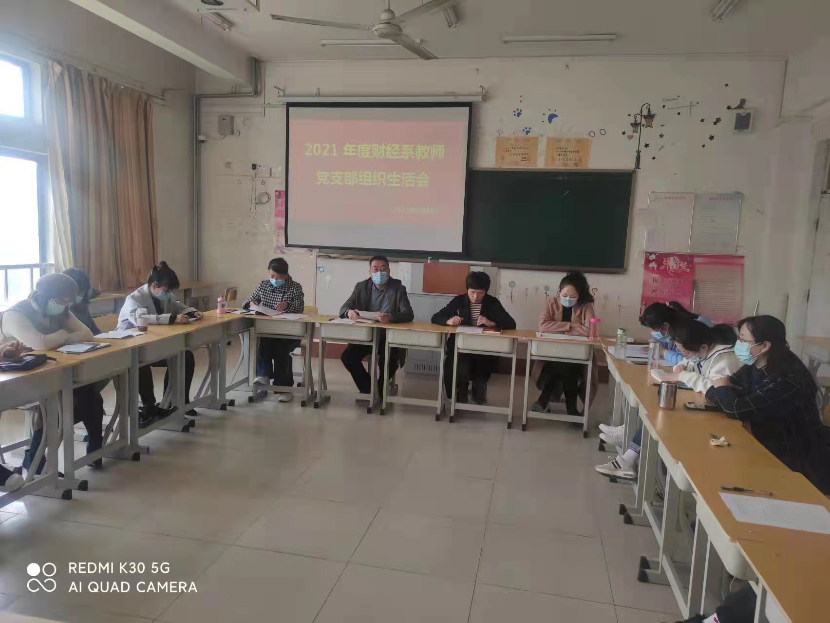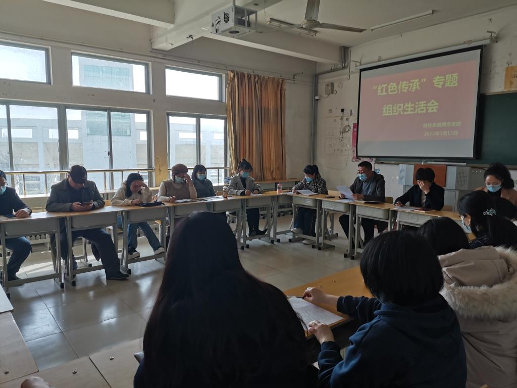 2022年3月15日下午,财经系教师党支部在明德楼405教室召开2021年度“红色传承”专题组织生活会,会议由财经系教师党支部书记张建明主持,学院党委委员、副院长张小烨及全体党员参加。