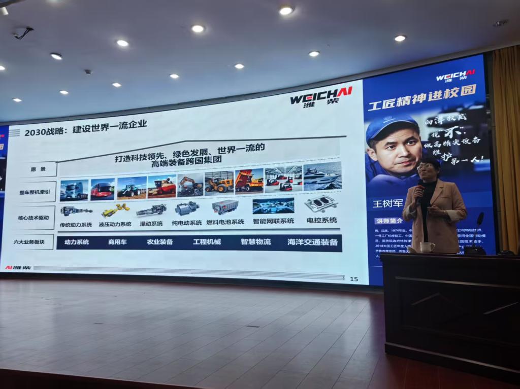 赵志勇介绍了潍柴集团的发展历程和产业布局,管丽芳则详细讲解了潍柴产业学院的运行模式,为学生们提供了未来职业发展的新思路。
