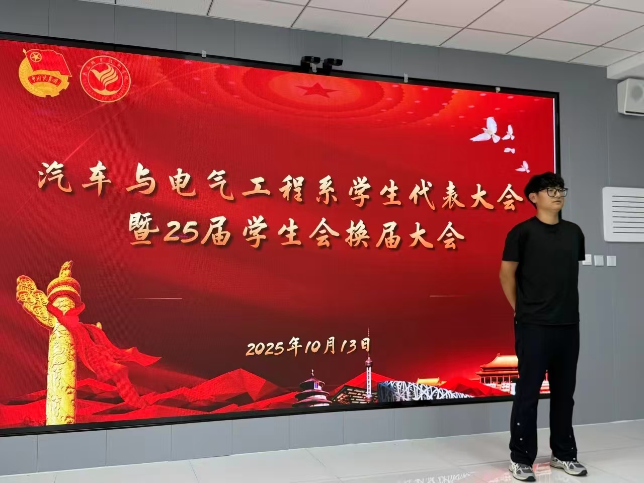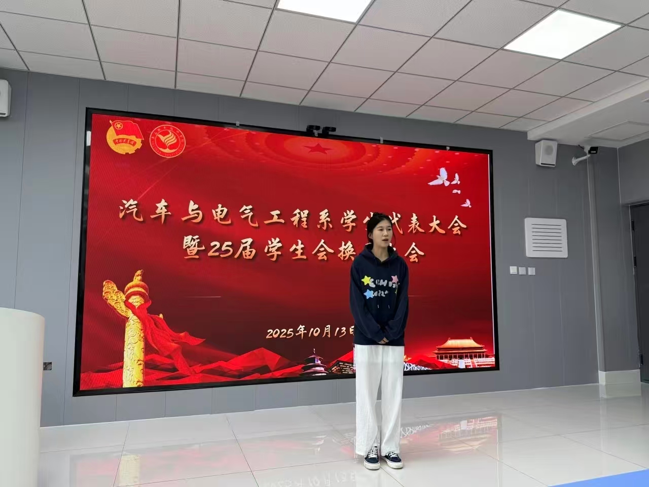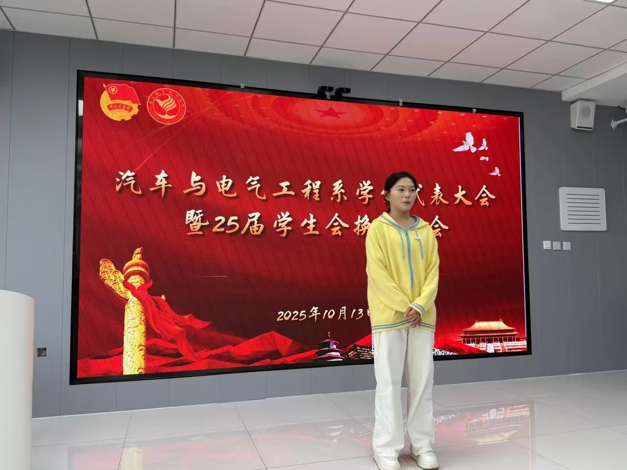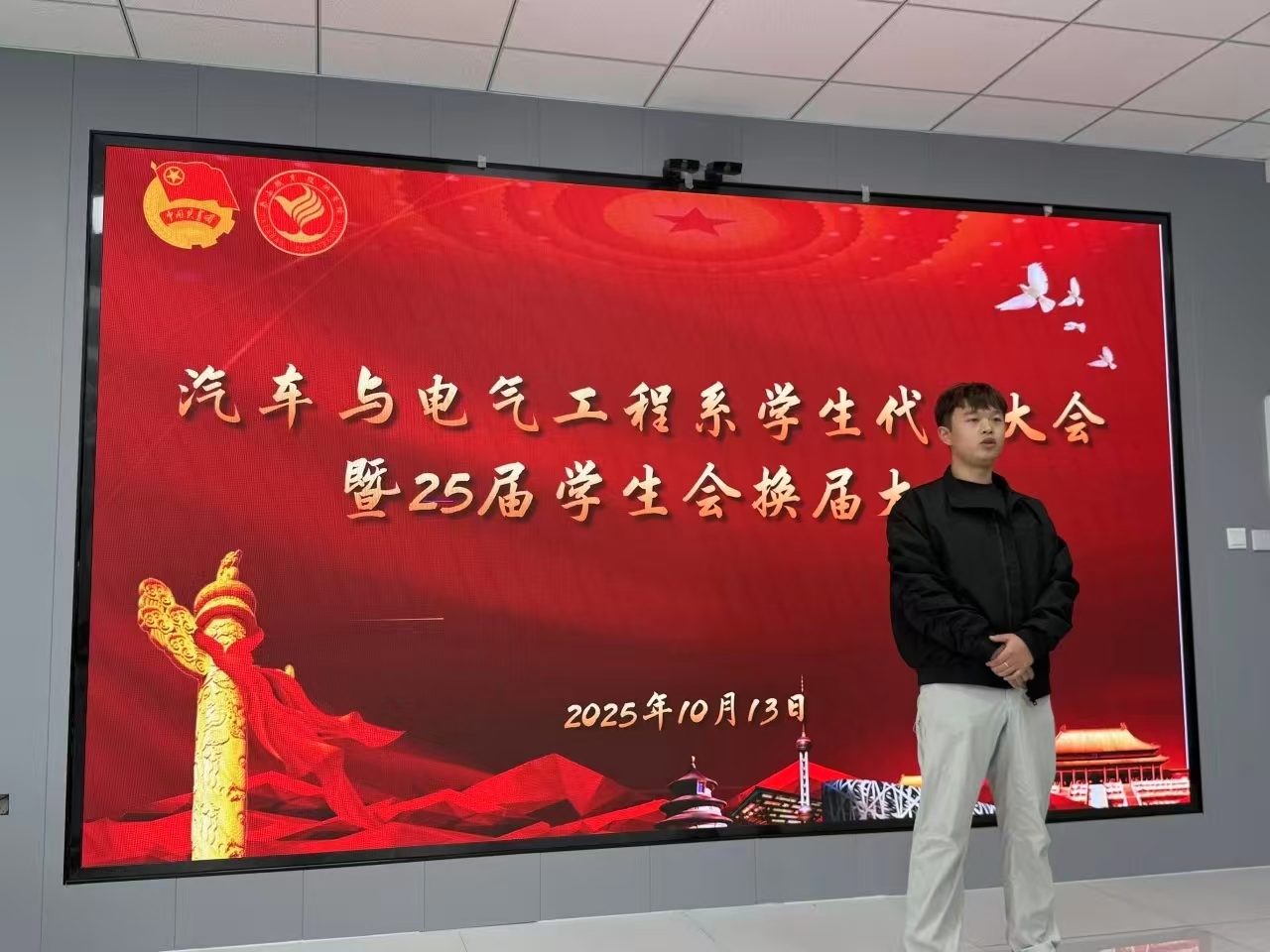 汽车与电气工程系于10月13日召开学生代表大会暨25届学生会换届选举大会。本次选举活动由汽电系副主任方增奎,学生科副科长张酉晨,苏一凤老师,王晓宇老师和郑浩然老师及各班学生代表参加。