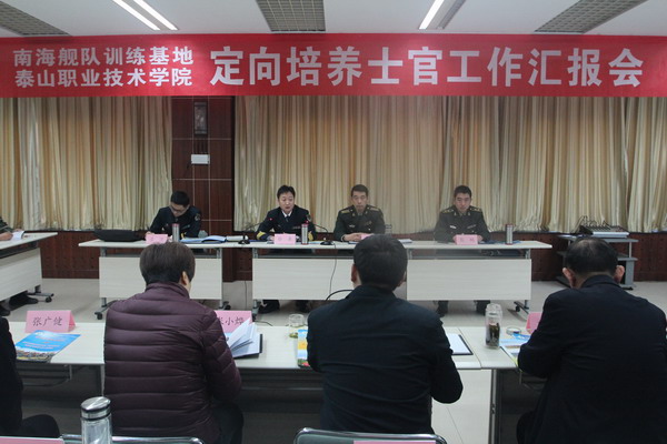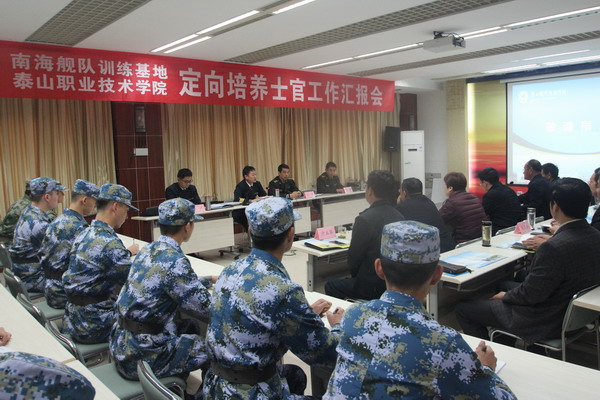 吴伟代表泰安军分区致辞,马培安主持汇报会。刘洪东从我院定向士官培养工作基础扎实,培养工作成效初显,打造定向士官培养“泰职样板”三个方面作了人才培养工作汇报。