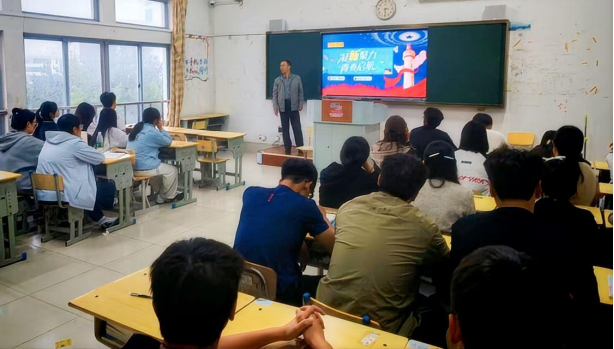 10月9日,基础部党总支书记韩廷水在明德楼313教室,为2025级健身指导与管理专业新生讲授《凝“新”聚力,青春启航》主题党课,助力新生坚定信念、明确方向。