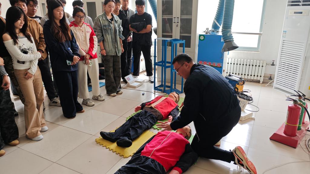 随后,李常军、刘佩玮老师针对急救技能展开教学。两位老师以模拟人体模型为教具,详细演示了心肺复苏(CPR)的操作步骤,从判断意识、胸外按压的位置与力度,到人工呼吸的正确姿势,每一个环节都进行了拆解讲解。同时,还现场指导师生学习海姆立克急救法,通过“手把手”示范,帮助大家掌握应对异物卡喉等紧急情况的处置方法,确保每位参与者都能清晰理解动作要领。