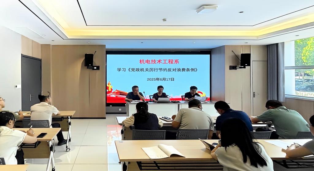 6 月 17 日,机电技术工程系在智能大楼 C205 组织开展《党政机关厉行节约反对浪费条例》专题学习活动,机电系党总支书记谭毅领学,全体教职工参与此次学习,旨在进一步增强教职工厉行节约、反对浪费的责任意识,推动形成勤俭节约的良好风尚。