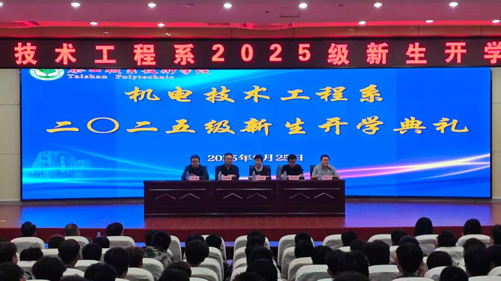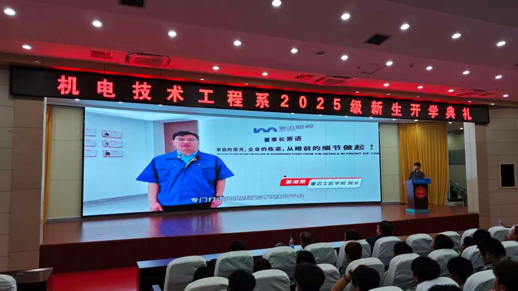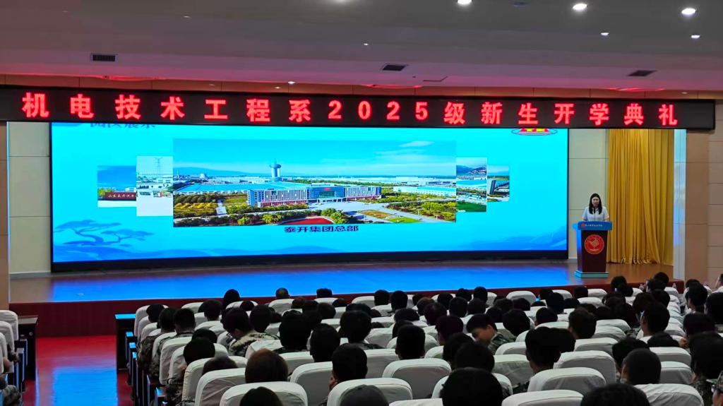 9月25日,机电技术工程系2025级新生开学典礼在图书馆礼堂隆重举行。豪迈集团与泰开集团代表受邀出席并上台宣讲企业文化,为新生们带来了一场生动的职业启蒙课。