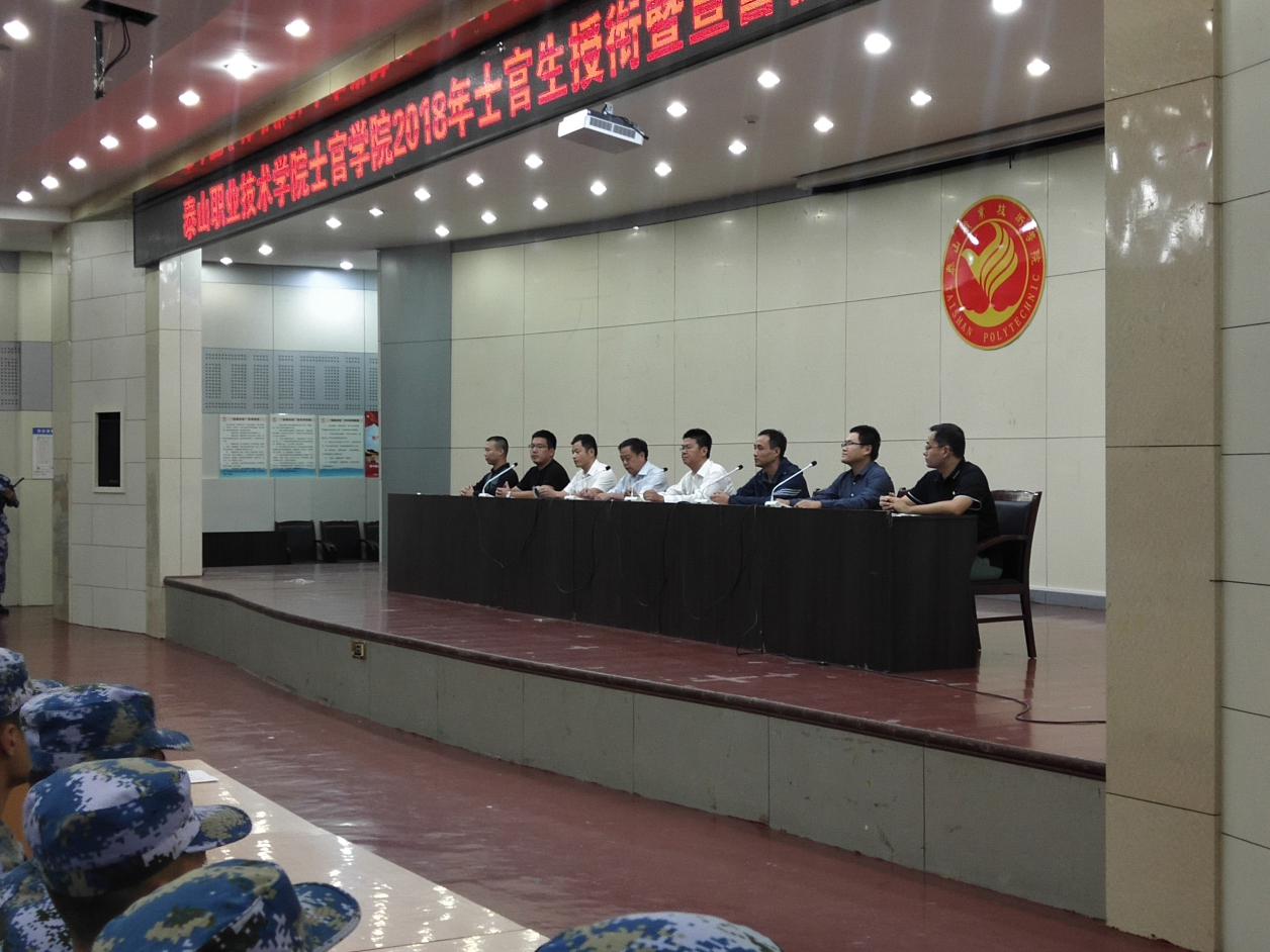 骄阳似火,青春洋溢,9月5日上午,泰山职业技术学院举行2018年新生开学典礼暨军训开训式。学院领导参加典礼并讲话。学院院长毕于民对新生的到来表示热烈欢迎,也提出了殷切希望:一是希望同学们转换角色尽快适应大学生活;二是要志存高远,做新时代大学生;三是要有家国情怀,践行工匠精神;四是融入社会,不断提高个人素养。开训仪式结束后为期两周的军训活动正式开始。